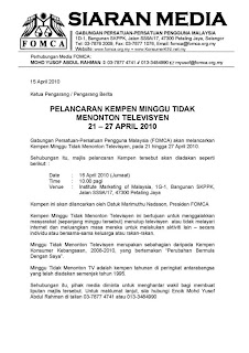 | KUALA LUMPUR, 15 April: Mungkin tidak berkaitan dengan pilihan raya kecil Hulu Selangor yang bakal berjalan pada 25 April ini, tetapi Gabungan Persatuan-Persatuan Pengguna Malaysia (FOMCA) akan melancarkan kempen Minggu Tidak Menonton Televisyen 21 hingga 27 April 2010.